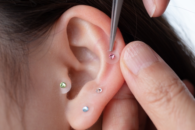 耳つぼ刺激用のシール、イヤージュエリーを貼付します。
